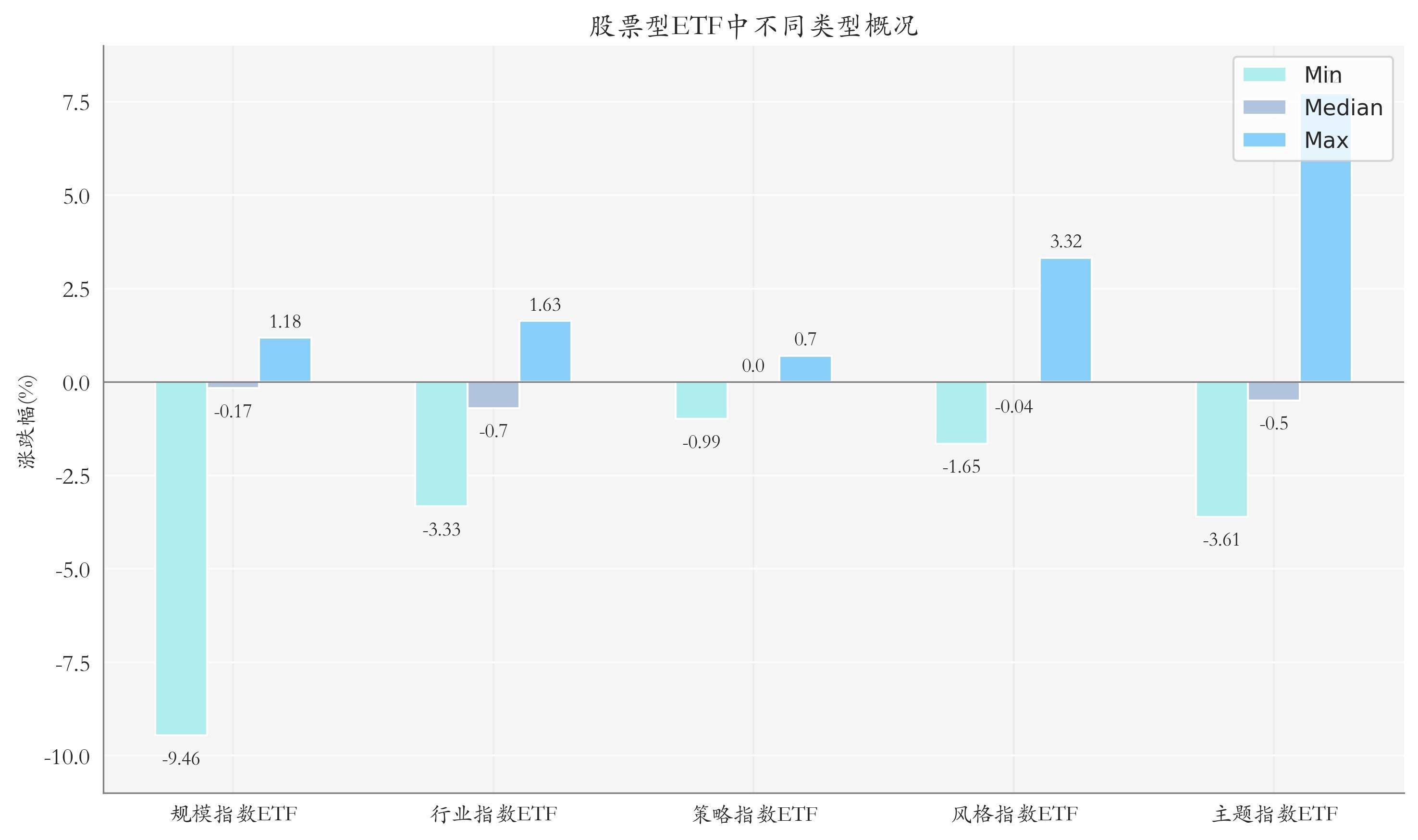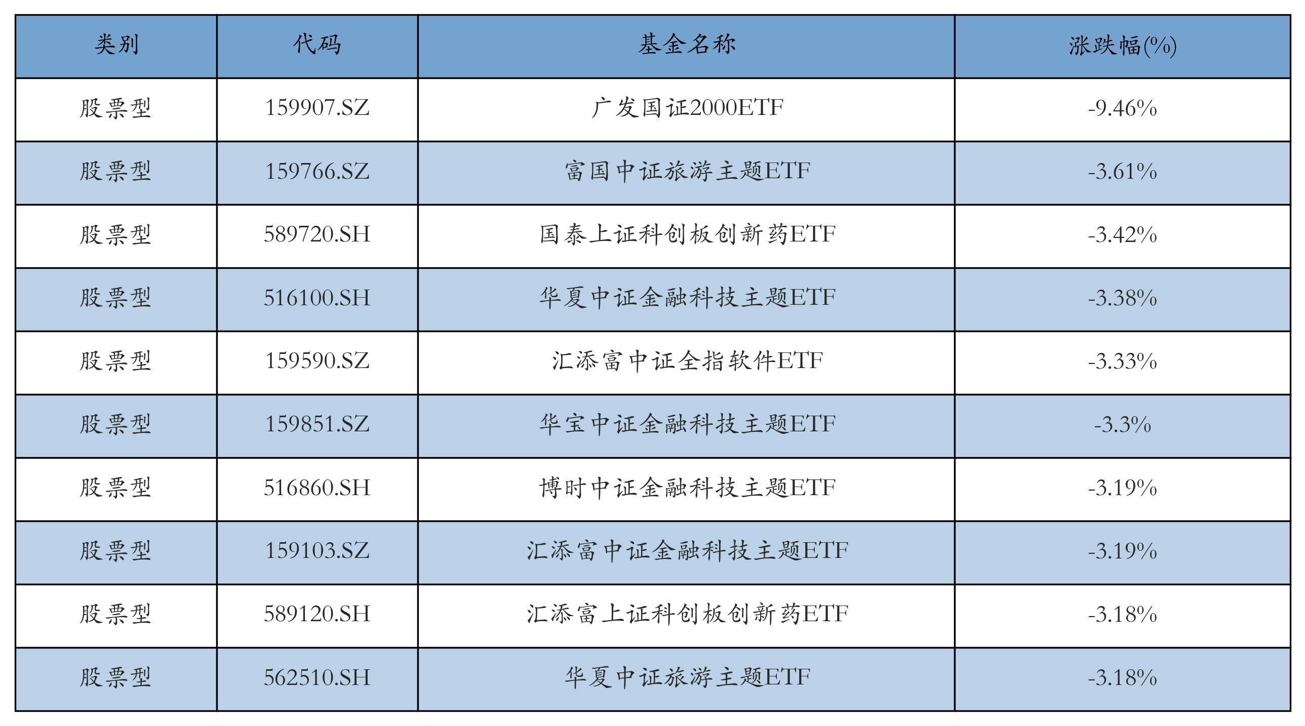 昨日股票型ETF跌幅最大的3只ETF及其收益率分别为:广发国证2000ETF(-9.46%)、富国中证旅游主题ETF(-3.61%)、国泰上证科创板创新药ETF(-3.42%)。跌幅前10详情见下表: