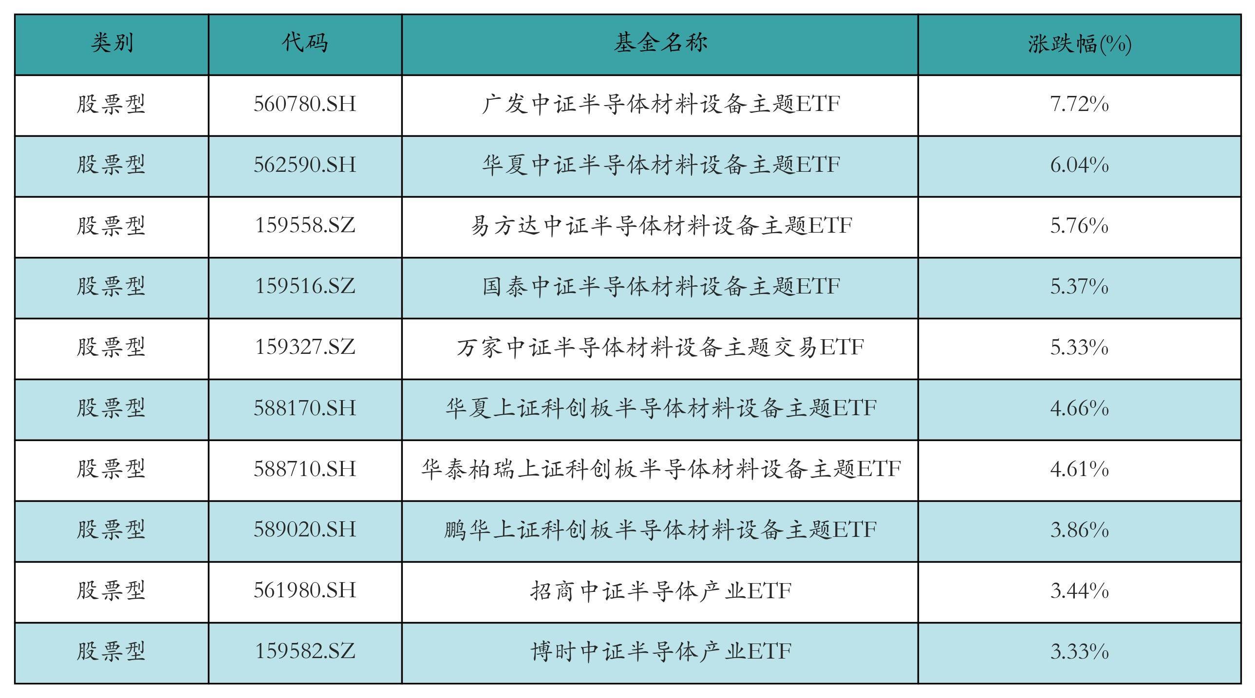 昨日股票型ETF涨幅最高的3只ETF及其收益率分别为:广发中证半导体材料设备主题ETF(7.72%)、华夏中证半导体材料设备主题ETF(6.04%)、易方达中证半导体材料设备主题ETF(5.76%)。涨幅前10详情见下表: