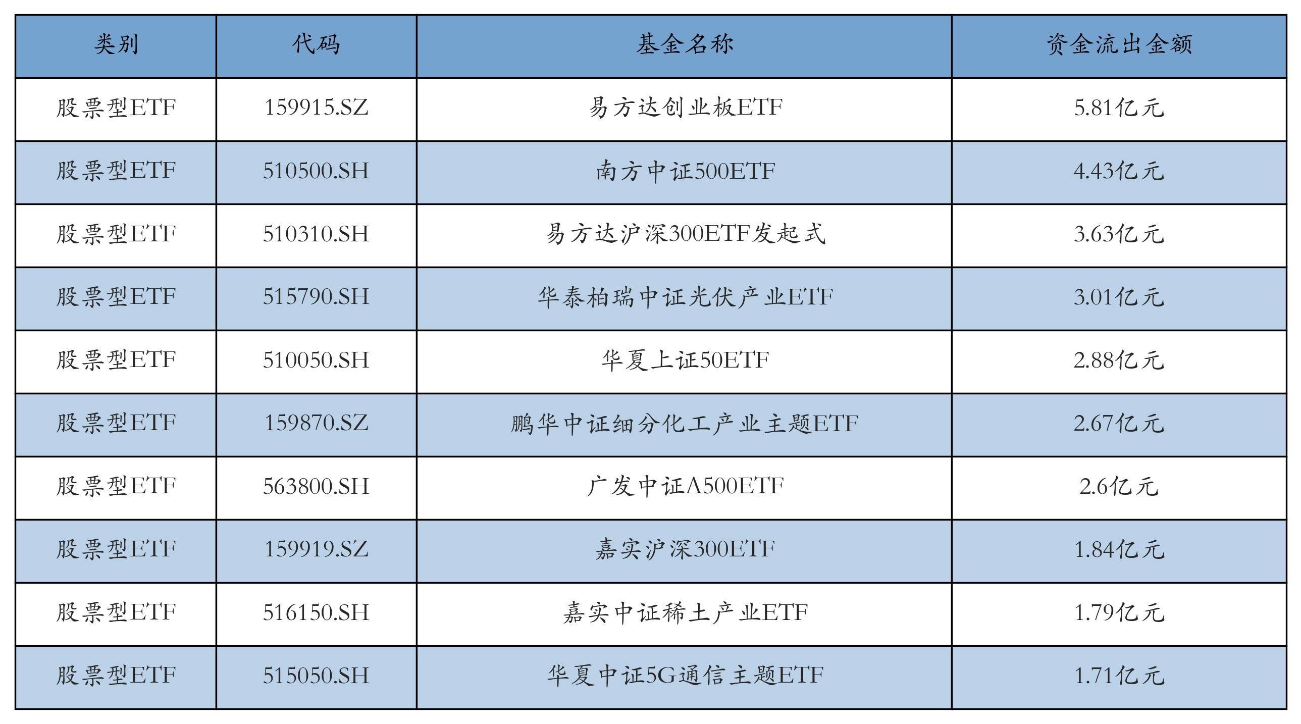 昨日股票型ETF资金流出最多的3只ETF及其流出金额分别为:易方达创业板ETF(流出5.81亿元)、南方中证500ETF(流出4.43亿元)、易方达沪深300ETF发起式(流出3.63亿元)。资金流出前10详情见下表: