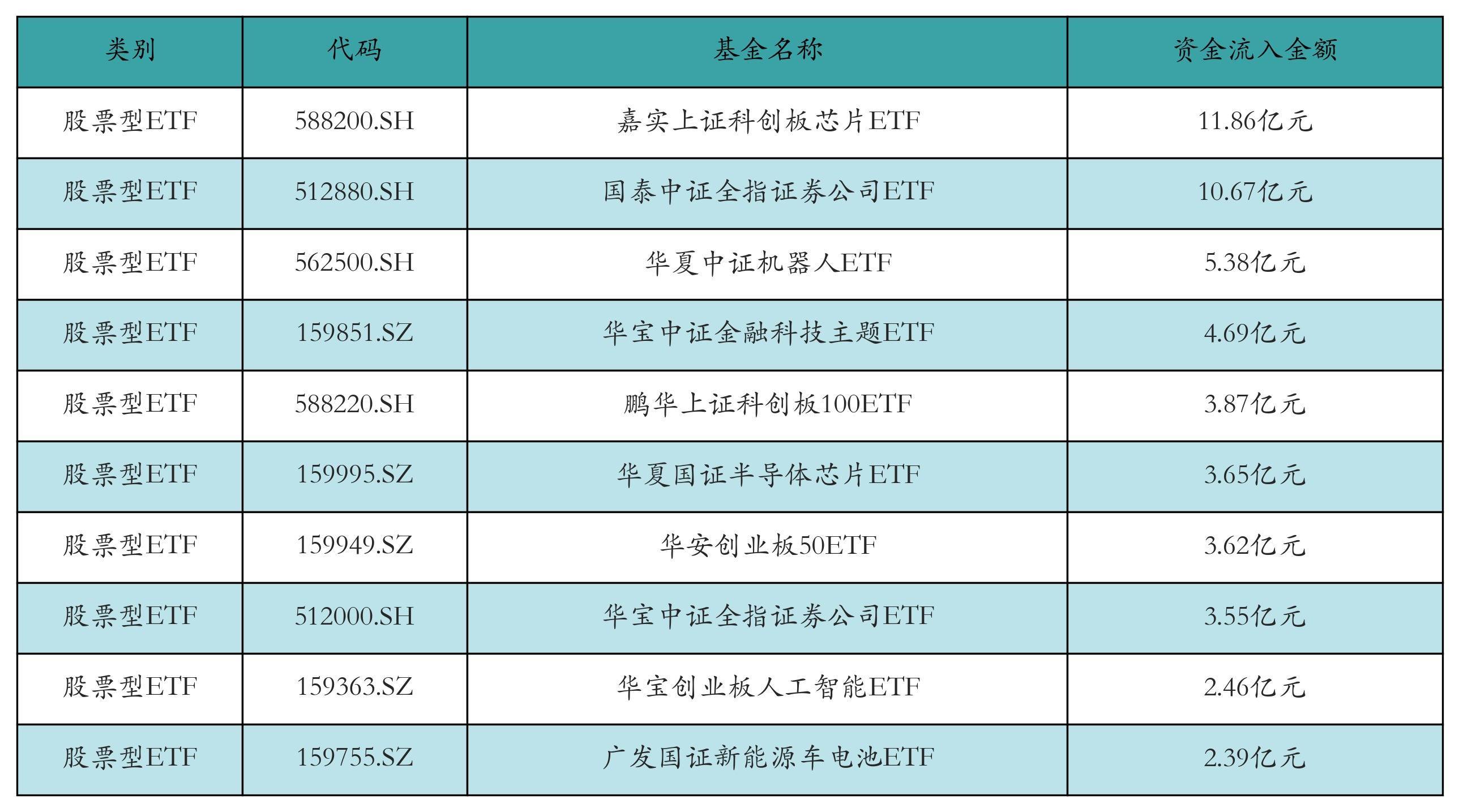 昨日股票型ETF资金流入最多的3只ETF及其流入金额分别为:嘉实上证科创板芯片ETF(流入11.86亿元)、国泰中证全指证券公司ETF(流入10.67亿元)、华夏中证机器人ETF(流入5.38亿元)。资金流入前10详情见下表: