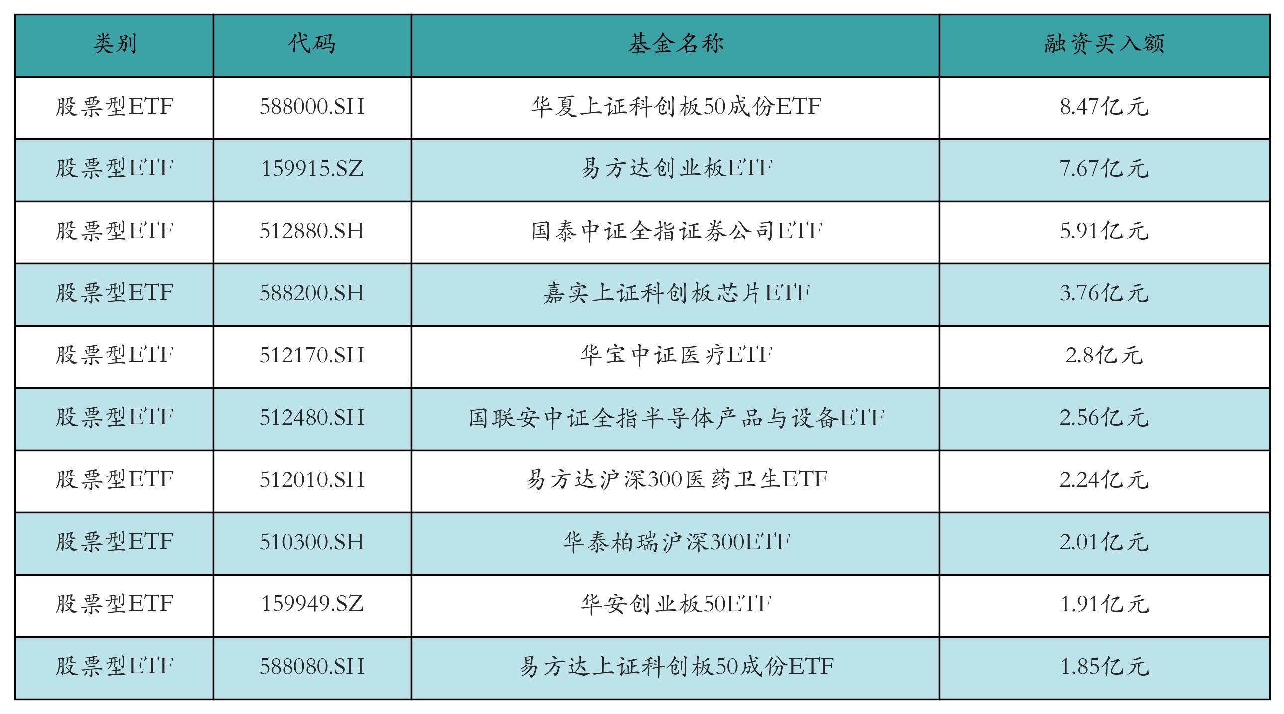 昨日股票型ETF融资买入额最高的3只ETF及其买入金额分别为:华夏上证科创板50成份ETF(8.47亿元)、易方达创业板ETF(7.67亿元)、国泰中证全指证券公司ETF(5.91亿元)。融资买入额前10详情见下表: