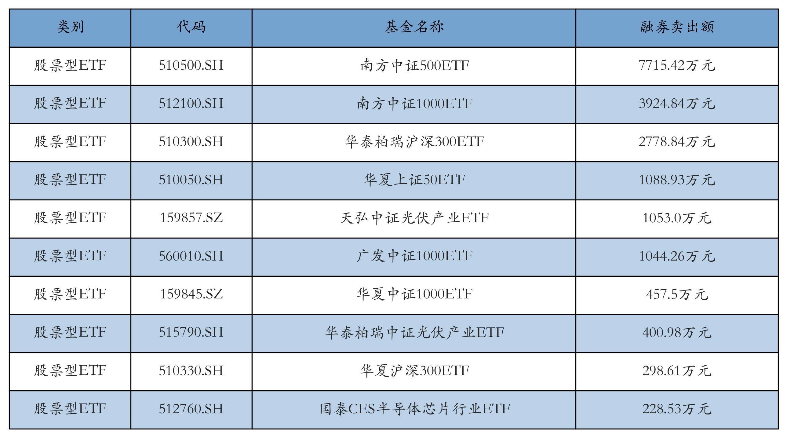 昨日股票型ETF融资卖出额最高的3只ETF及其卖出金额分别为:南方中证500ETF(7715.42万元)、南方中证1000ETF(3924.84万元)、华泰柏瑞沪深300ETF(2778.84万元)。融券卖出额前10详情见下表: