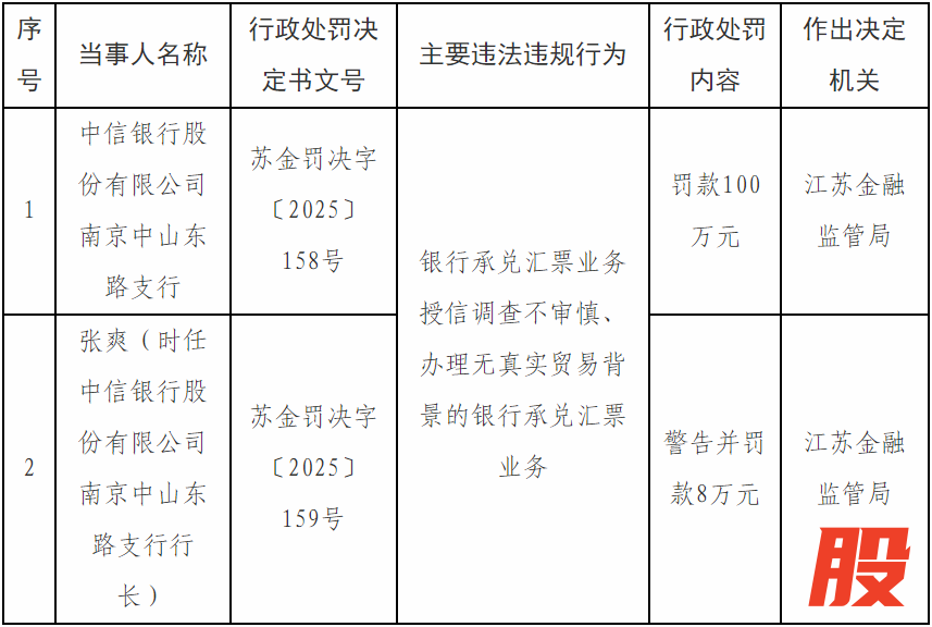 中信银行南京中山东路支行因银行承兑汇票业务授信调查不审慎、办理无真实贸易背景的银行承兑汇票业务的违法行为,被江苏金融监管局罚款100万元。