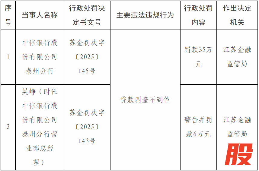 中信银行泰州分行因贷款调查不到位的违法行为,被江苏金融监管局罚款35万元。