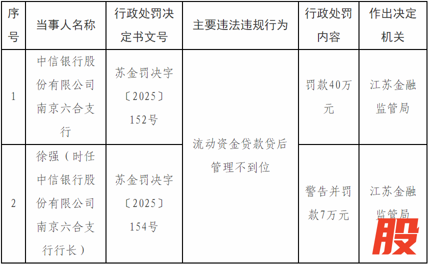 中信银行南京六合支行因流动资金贷款贷后管理不到位的违法行为,被江苏金融监管局罚款40万元。