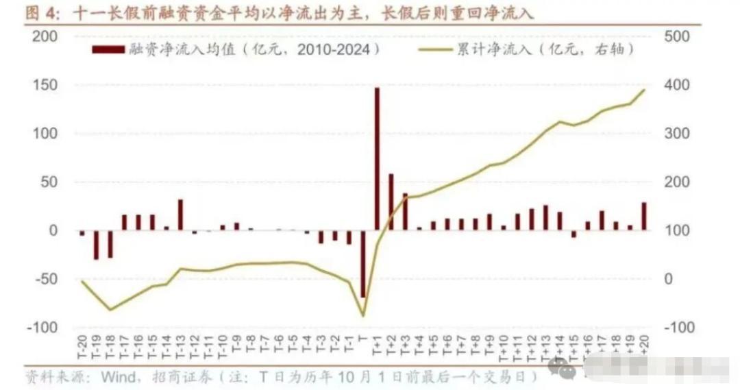 引用招商证券整理的数据,十一长假前融资资金平均以净流出为主,长假后则重回净流入。